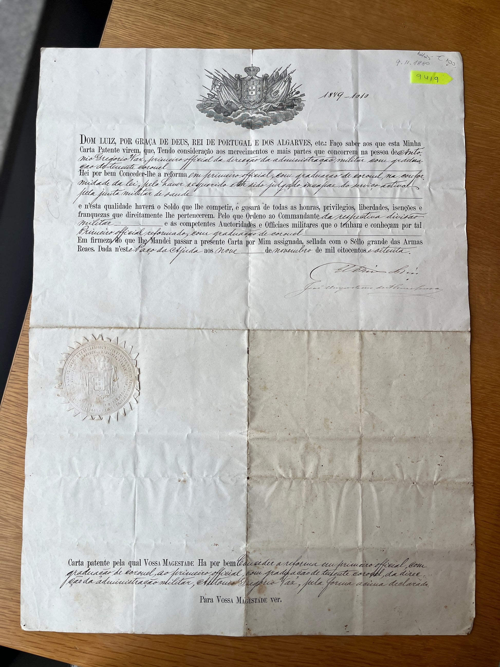 Manuscrito oficial em papel, constituído por carta-patente régia passada em nome de D. Luís I, Rei de Portugal e dos Algarves, datada de 9 de Novembro de 1879, com averbações posteriores até 1881. O documento encontra-se redigido em grande formato, manuscrito a tinta, com brasão real português impresso no topo e selo branco em relevo com as Armas Reais, Assinaturas de El Rei e de João...de Abreu e Sousa.
