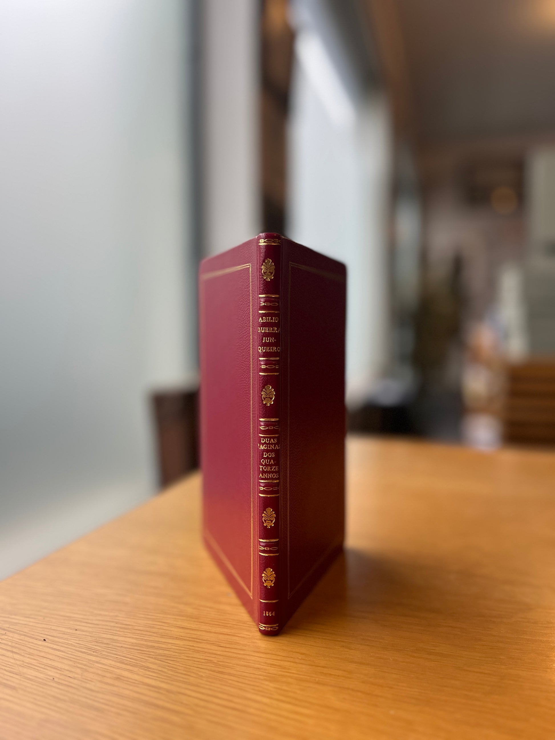 Enc. em inteira de chagrin, apresenta filetes dourados enquadrando as pastas, lombada com ferros decorativos a ouro. Encadernação sólida, elegante e de apresentação superior, valorizando o exemplar e garantindo excelente conservação. Preserva as capas de brochura ( com pequenos restauros) e valorizado com dedicatória do autor. são 16 págs. não numeradas; 20cm.