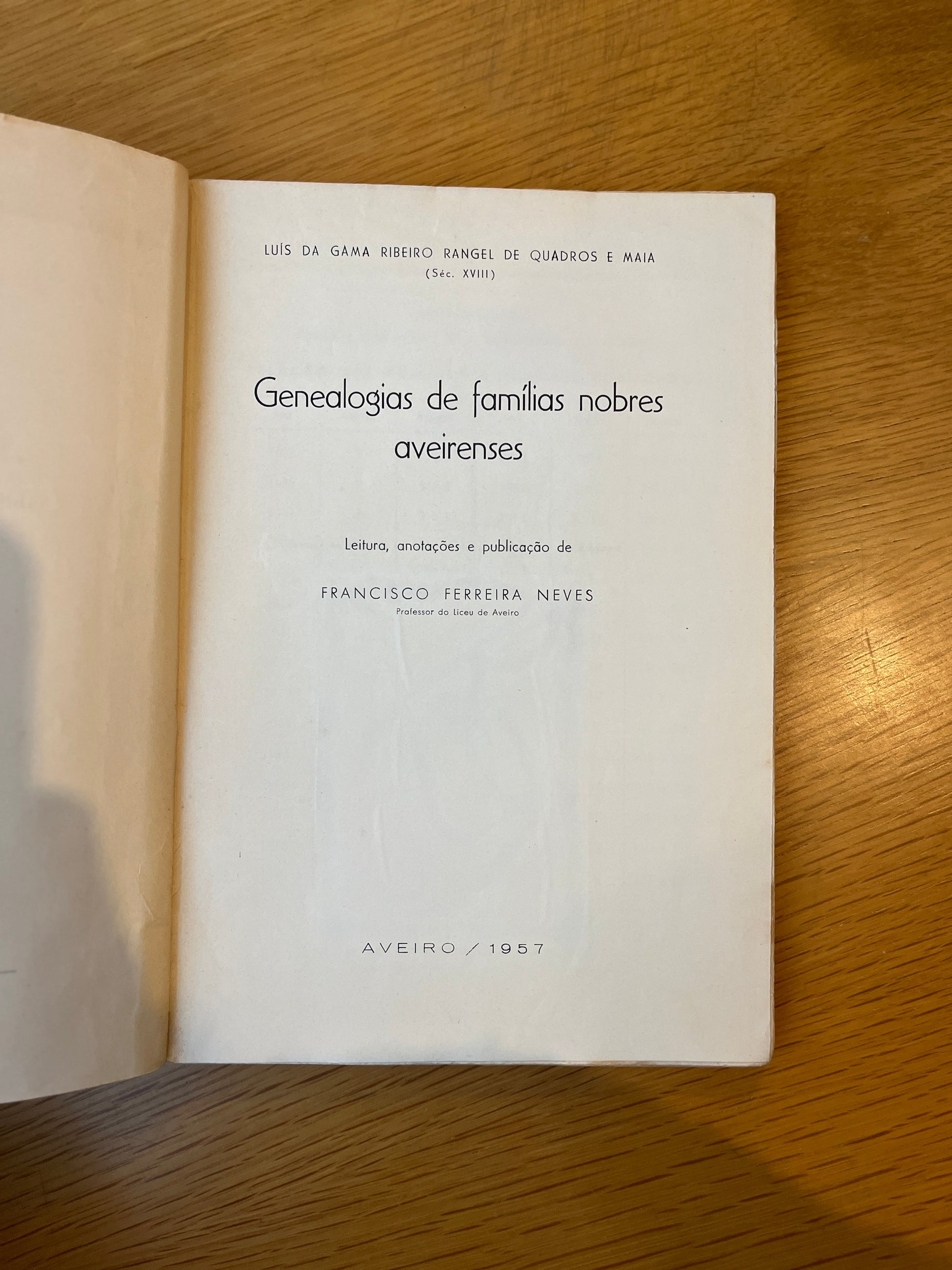 "(...) Estas genealogias foram escritas na primeira metade do século XVIII por Luis da Gama Ribeiro Rangel de Quadros e Maia. O seu conhecimento é absolutamente necessário para se fazer a história política e económica de Aveiro, e serve também como subsídio para a história geral da Nação. (...) No século XVI eram já muitas as famílias nobres residentes em Aveiro. Aqui se tinham estabelecido os Tavares, os Sousas, os Barretos, os quadros, os Rangéis, os Almeidas, os Cardosos, etc. Nos séculos XVII e XVIII novas famílias aparecem, mas também outras se extinguem. (...)" In- Nota Prévia Leitura, anotações e publicação de Francisco Ferreira Neves (professor do Liceu de Aveiro)