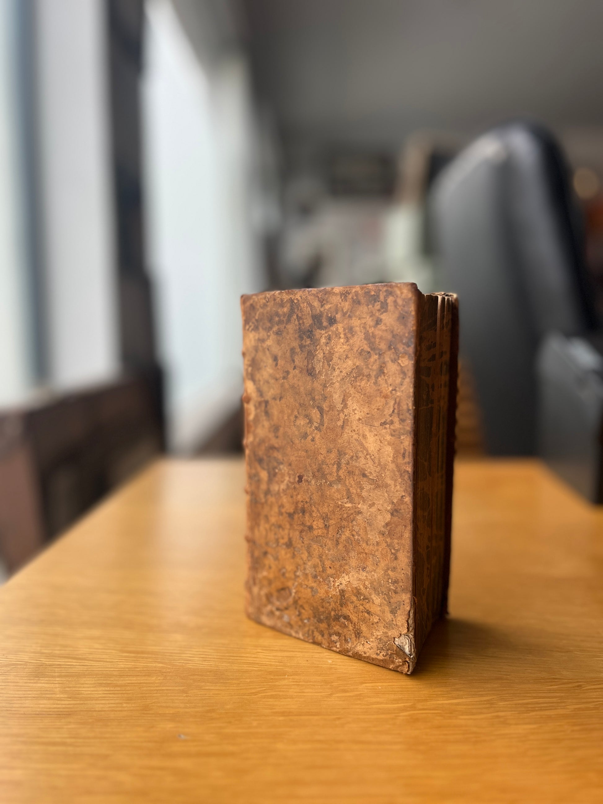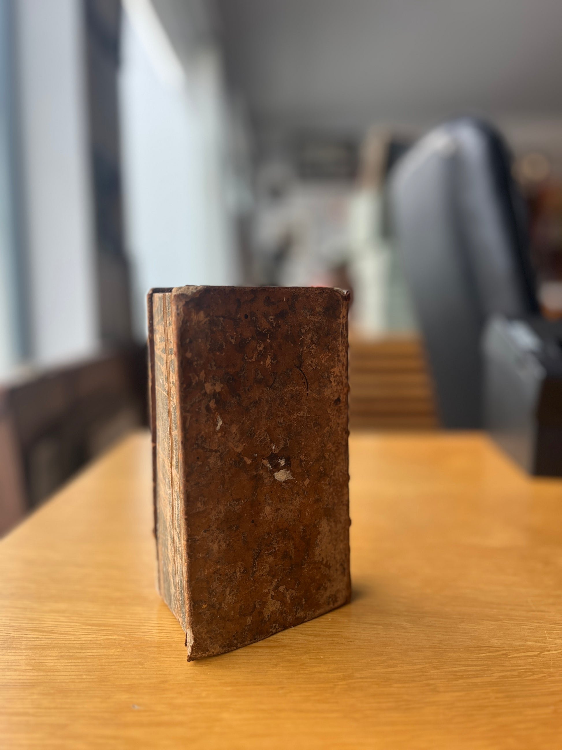 Com pequena falha de papel no canto inferior direito na página 483 e no anterrosto. Contém 14 gravuras desdobráveis, estando a primeira bastante danificada, com falha de papel que afeta o texto. Marmoreado em todo o corte.