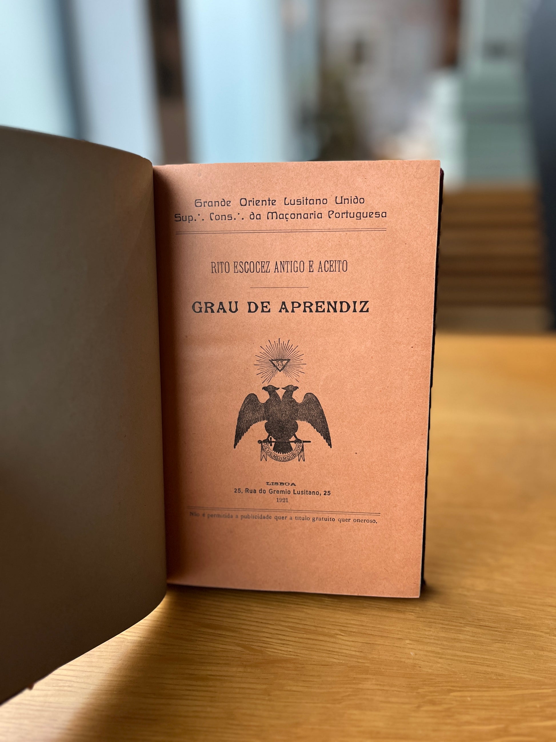 - Rito Escocês Antigo e Aceito – Grau de Aprendiz. Lisboa, 1921. Publicação do Supremo Conselho da Maçonaria Portuguesa, com o emblema do duplo-águia e a divisa Deus Meumque Jus. 108+(1) pág.s.