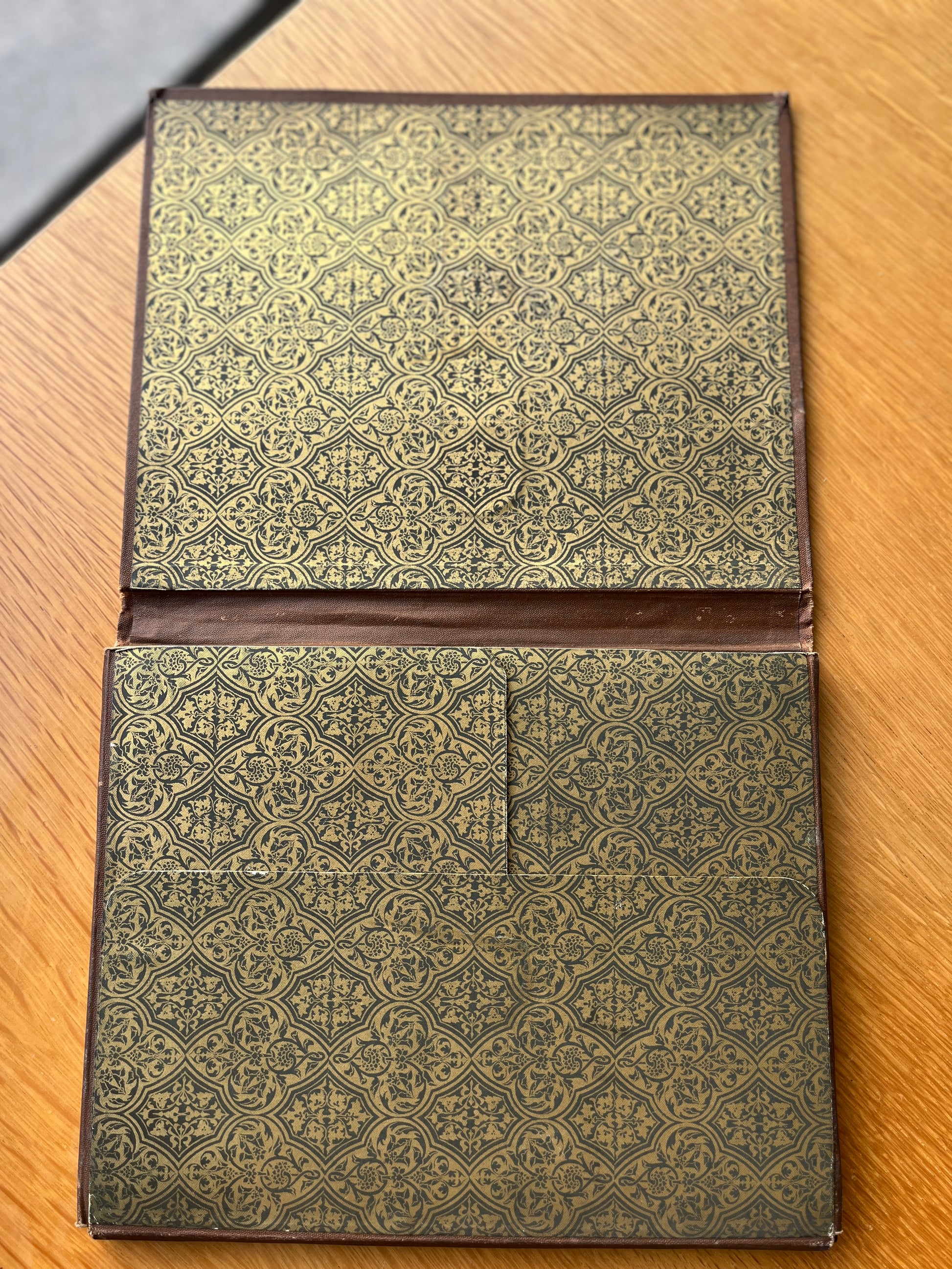 Encadernação/caixa em tela castanha com ferros a ouro e preto, que contém 26 reproduções fotográficas de vários locais do Mosteiro da Batalha, desde o túmulo de D. Duarte e Dona Leonor, bem como a frontaria principal, entre outros. Com 23,5 cm.
