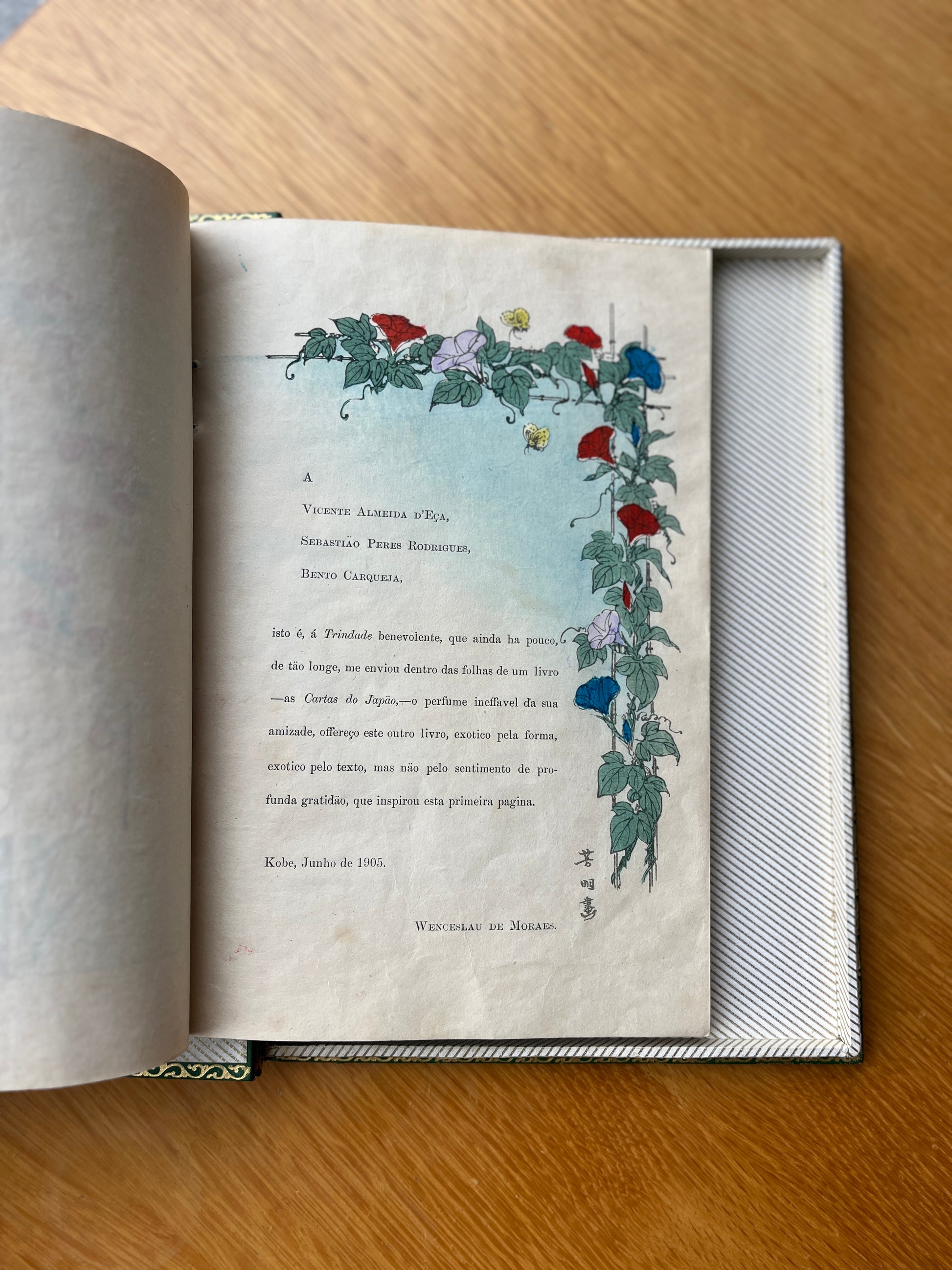 Este exemplar possui uma caixa em inteira de pele com ferros e desenhos a ouro na lombada e nas duas pastas com motivos orientais, executada pelo mestre encadernador de Lisboa, Frederico d'Almeida.