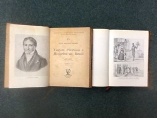 Descrição: Livraria Martins, São Paulo - 1940. Biblioteca Histórica Brasileira, Direcção de Rubens Borba de Moraes - IV São 3 volumes em 2 Tomos ( ou livros ) com enc. da época de lomb. em pele, com as capas de brochura; (12)+ 295+ (2) e 302+ (1) pág.; muito ilustrados com várias estampas extratexto; 26 cm. Os exemplares com alguma acidez, como é habitual nesta obra e nesta edição, própria da qualidade do papel. O 1º volume com 4 carimbos na pág. ( 6 ). Retrato do autor no último volume. " (...) A crítica brasileira não recebeu a obra com muito entusiasmo. Pelo contrário. O Instituto Histórico e Geográfico Brasileiro fêz- lhe críticas severas. Os veneráveis historiadores acharam chocante que se pintassem costumes de escravos e cenas da vida popular com tanto realismo. Entretanto, passado um século, é justamente aquilo que se criticou que mais elogios merece e que torna o livro de Debret um documento de valor incomparável para o estudo da época em que viveu entre nós. Elogiado unânimemente, há muito que se tornou raro e sobretudo caríssimo. É talvez das obras sobre o Brasil, publicadas no século XIX, uma das que maior preço alcançam. Não teve edições posteriores à primeira. Sòmente agora, um século depois do aparecimento do seu útimo volume, é que sai, em segunda edição integral e fiel, nesta Biblioteca Histórica Brasileira." R. Borba de Moraes.